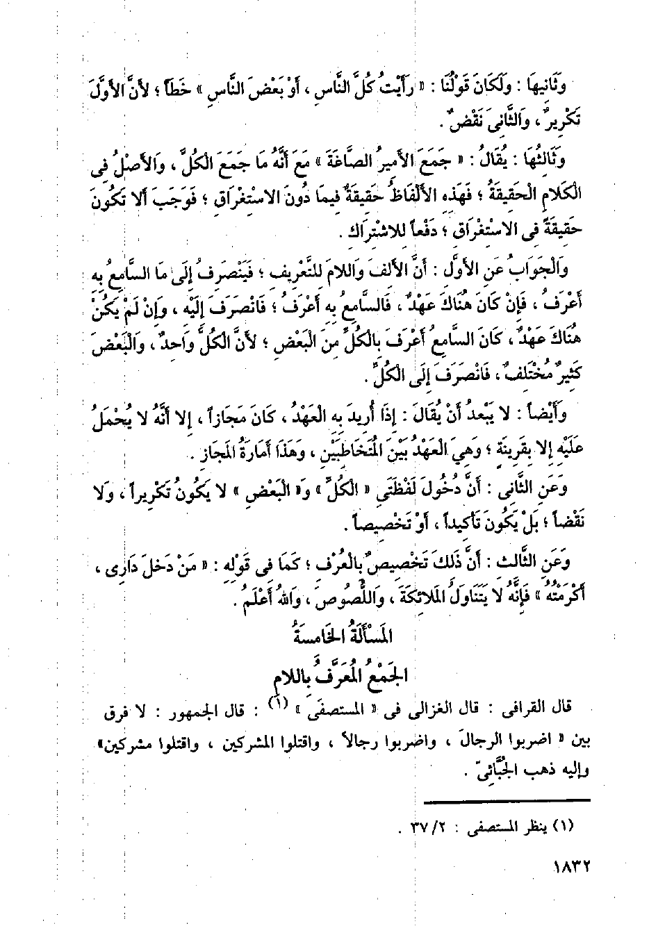 وثالثها: يقال: جمع الأمير الصاغة " مع أنه ما جمع الكل، والأصل في الكلام الحقيقة؛ فهذه الألفاظ حقيقة فيما دون الاستغراق؛ فوجب ألا تكون حقيقة في الاستغراق؛ دفعا للاشتراك.