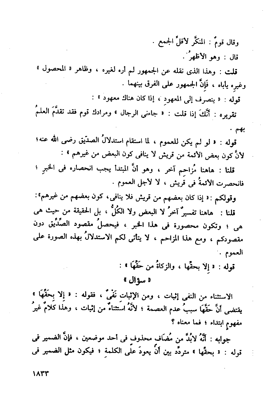 قلنا: هاهنا تفسير آخر لا البعض ولا الكل، بل الحقيقة من حيث هي هي؛ وتكون محصورة في هذا الخبر، فيحصل مقصود الصديق دون مقصودكم، ومع هذا المزاحم، لا يتأتى لكم الاستدلال بهذه الصورة على العموم.