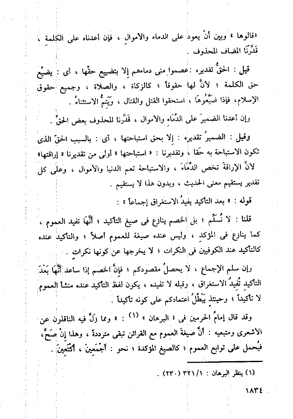وقد قال إمام الحرمين في (البرهان): " وما زل فيه الناقلون عن الأشعري ومتبعيه: أن صيغة العموم مع القرائن تبقى مترددة، وهذا إن صح، فيحمل على توابع العموم؛ كالصيغ المؤكده؛ نحو: أجمعين، أكتعين.