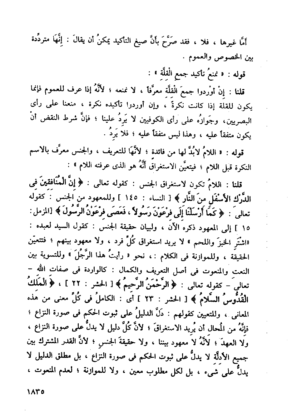 قلنا: إن أوردوا جمع القلتة معرفا، لا نمنعه؛ لأنه إذا عرف للعموم فإنما يكون للقلة إذا كانت نكرة، وإن أوردوا تأكيده نكرة، منعنا على رأي البصريين، وجوازه على رأي الكوفيين لا يرد علينا؛ فإن شرط النقض أن يكون متفقا عليه، وهذا ليس متفقا عليه؛ فلا يرد.