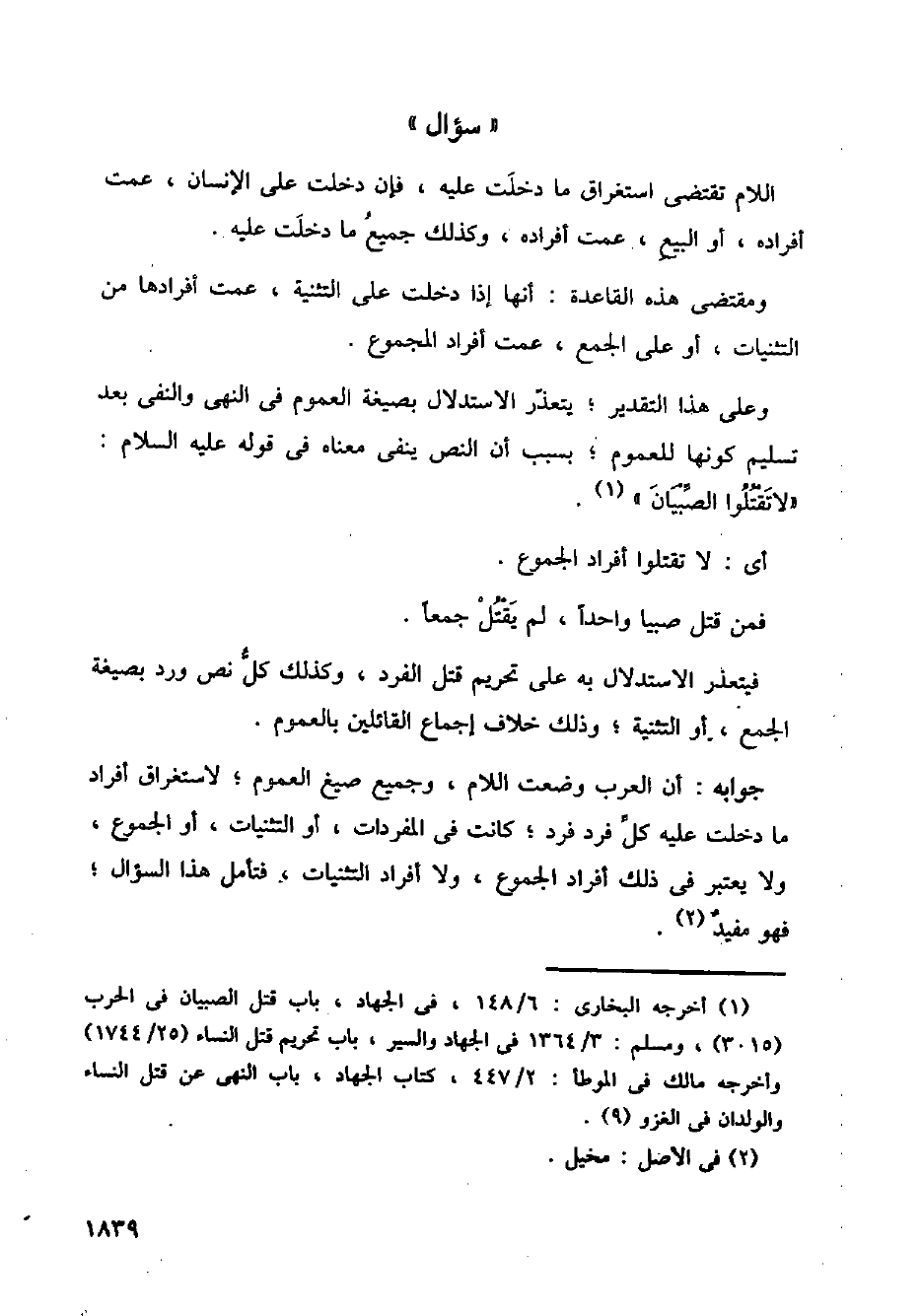 جوابه: أن العرب وضعت اللام، وجميع صيغ العموم؛ لاستغراق أفراد ما دخلت عليه كل فرد فرد؛ لكانت في المفردات، أو التثنيات، أو الجموع، ولا يعتبر في ذلك أفراد الجموع، ولا أفراد التثنيات، فتأمل هذا السؤال؛ فهو مفيد