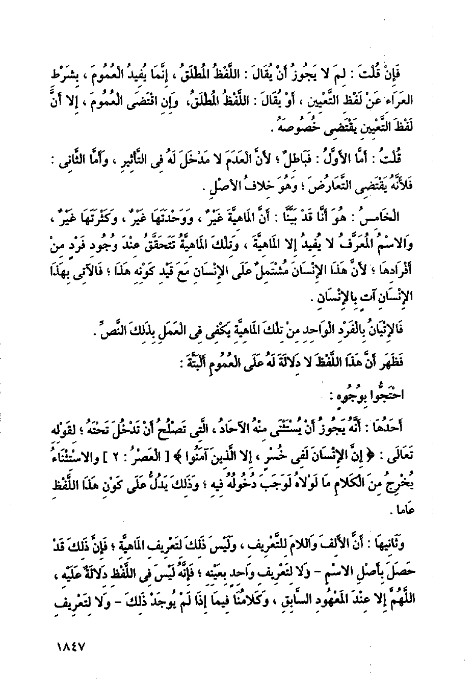 الخامس: هو أنا قد بينا: أن الماهية غير، ووحدتها غير، وكثرتها غير، والاسم المعرف لا يفيد إلا الماهية، وتلك الماهية تتحقق عند وجود فرد من أفرادها؛ لأن هذا الإنسان مشتمل على الإنسان مع قيد كونه هذا؛ فالآتي بهذا الإنسان آت بالإنسان.