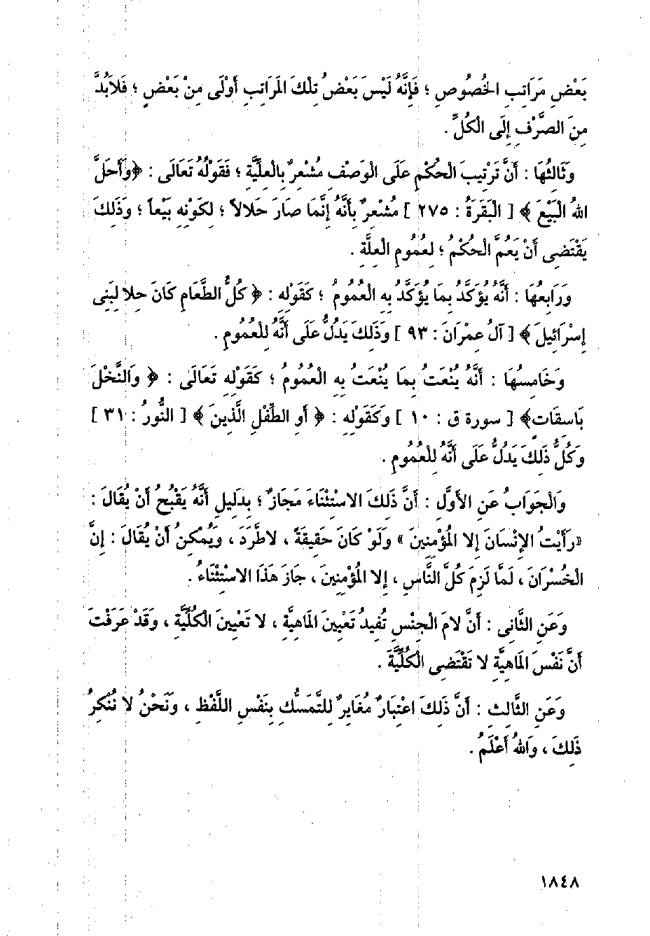 وعن الثاني: أن لام الجنس تفيد تعيين الماهية، لا تعيين الكلية، وقد عرفت أن نفس الماهية لا تقتضي الكلية.