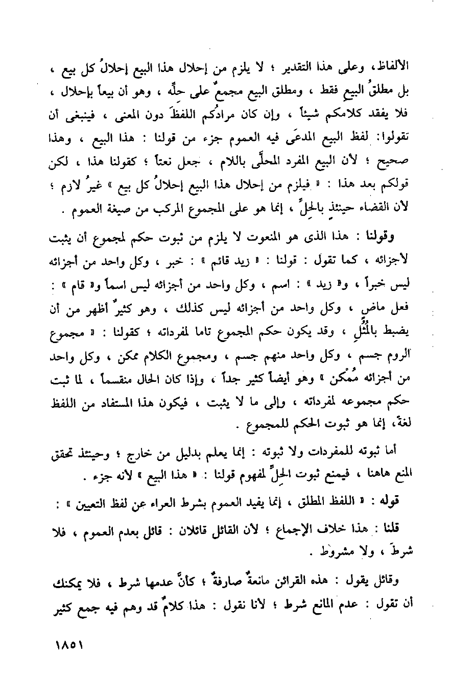 الألفاظ، وعلى هذا التقدير؛ لا يلزم من إحلال هذا البيع إحلال كل بيع، بل مطلق البيع فقط، ومطلق البيع مجمع على حله، وهو أن بيعا بإحلال، فلا يفقد كلامكم شيئا، وإن كان مرادكم اللفظ دون المعنى، فينبغي أن تقولوا: لفظ البيع المدعي فيه العموم جزء من قولنا: هذا البيع، وهذا صحيح؛ لأن البيع المفرد المحلى باللام، جعل نعتا؛ كقولنا هذا، لكن قولكم بعد هذا: " فيلزم من إحلال هذا البيع إحلال كل بيع " غير لازم؛ لأن القضاء حينئذ بالحل، إنما هو على المجموع المركب من صيغة العموم.