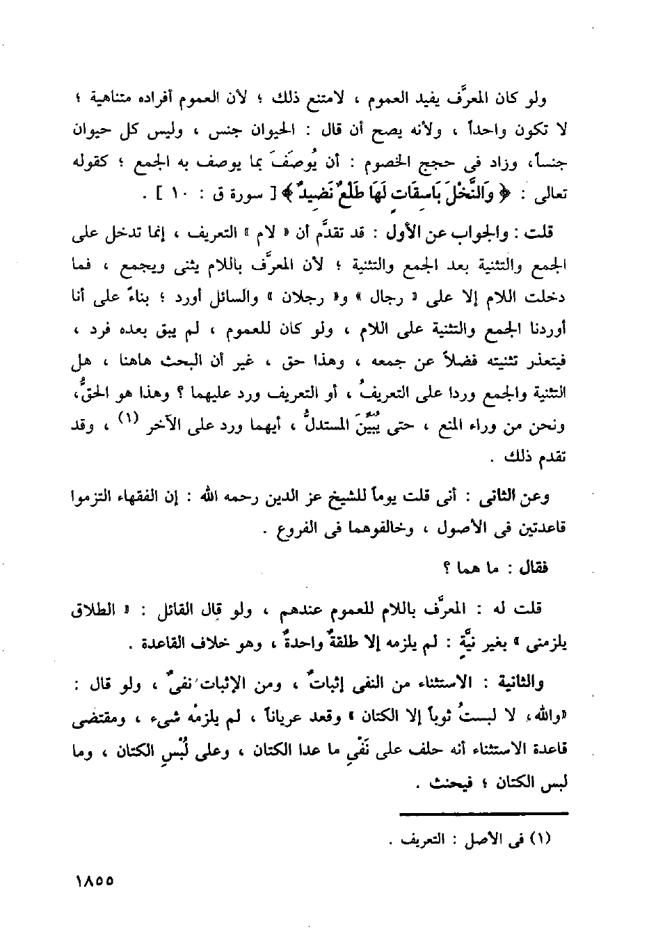 ولو كان المعرف يفيد العموم، لامتنع ذلك؛ لأن العموم أفراده متناهية؛ لا تكون واحدا، ولأنه يصح أن قال: الحيوان جنس، وليس كل حيوان جنسا، وزاد في حجج الخصوم: أن يوصف بما يوصف به الجمع؛ كقوله تعالى: {والنخل باسقات لها طلع نضيد} [سورة ق: 10].