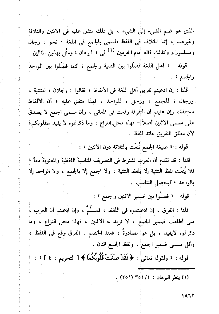 قلنا: إن ادعيتم تفريق أهل اللغة في الألفاظ؛ فقالوا: رجلان؛ للتثنية، ورجال؛ للجمع، ورجل؛ للواحد، فهذا متفق عليه؛ أن الألفاظ مختلفة، وإن عنيتم أن التفرقة وقعت في المعاني، وأن مسمى الجمع لا يصدق على مسمى الاثنين أصلا فهذا محل النزاع، وما ذكرتموه لا يفيد مطلوبكم؛ لأن مطلق التفريق عائد للفظ.