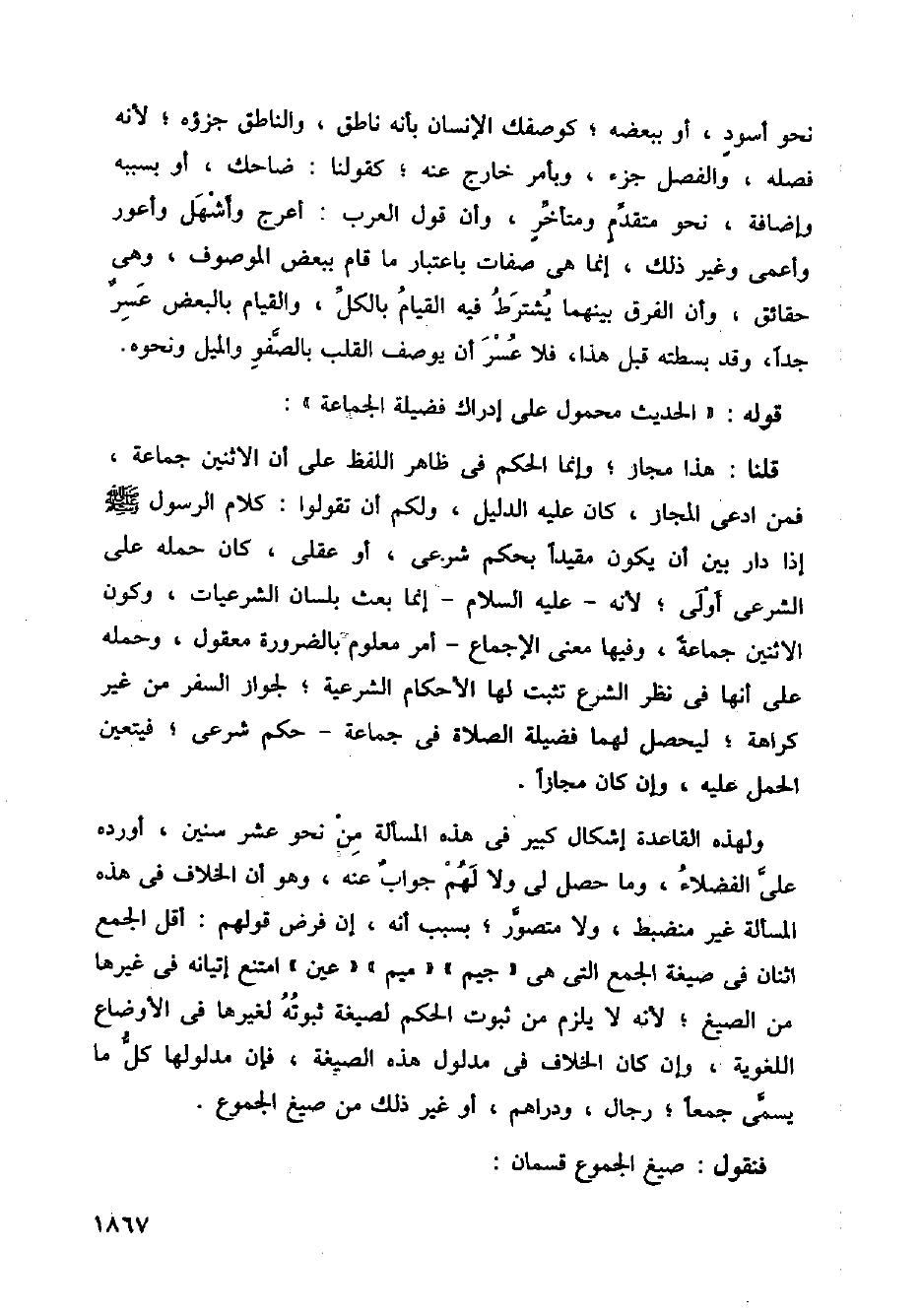 قلنا: هذا مجاز؛ وإنما الحكم في ظاهر اللفظ على أن الاثنين جماعة، فمن أدعى المجاز، كان عليه الدليل، ولكم أن تقولوا: كلام الرسول صلى الله عليه وسلم إذا دار بين أن يكون مقيدا بحكم شرعي، أو عقلي، كان حمله على الشرعي أولى؛ لأنه عليه السلام إنما بعث بلسان الشرعيات، وكون الاثنين جماعة، وفيها معنى الإجماع أمر معلوم بالضرورة معقول، وحمله على أنها في نظر الشرع تثبت لها الأحكام الشرعية؛ لجواز السفر من غير كراهة؛ ليحصل لهما فضيلة الصلاة في جماعة حكم شرعي؛ فيتعين الحمل عليه، وإن كان مجازا.