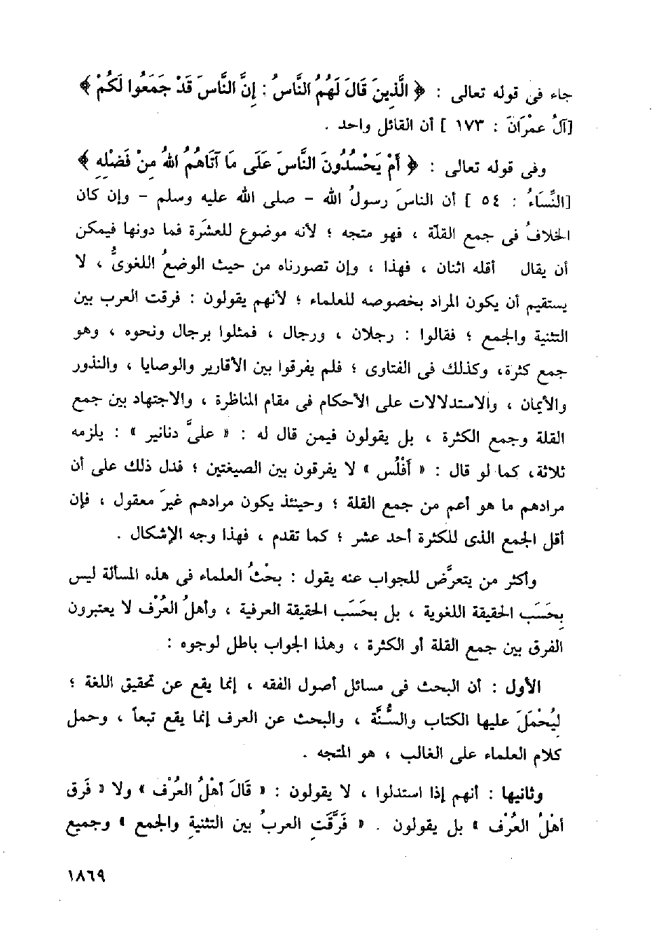 وفي قوله تعالى: {أم يحسدون الناس على ما آتاهم الله من فضله} [النساء: 54] أن الناس رسول الله صلى الله عليه وسلم وإن كان الخلاف في جمع القلة، فهو متجه؛ لأنه مجموع للعشرة فما دونها فيمكن أن يقال أقله اثنان، فهذا، وإن تصورناه من حيث الوضع اللغوي، لا يستقيم أن يكون المراد بخصوصه للعلماء؛ لأنهم يقولون: فرقت العرب بين التثنية والجمع؛ فقالوا: رجلان، ورجال، فمثلوا برجال ونحوه، وهو جمع كثرة، وكذلك في الفتاوى؛ فلم يفرقوا بين الأقارير والوصايا، والنذور والأيمان، والاستدلالات على الأحكام في مقام المناظرة، والاجتهاد بين جمع القلة وجمع الكثرة، بل يقولون فيمن قال له: " على دنانير ": يلزمه ثلاثة، كما لو قال (أفلس) لا يفرقون بين الصيغتين؛ فدل ذلك على أن مرادهم ما هو أعم من جمع القلة؛ وحينئذ يكون مرادهم غير معقول، فإن أقل الجمع الذي للكثرة أحد عشر؛ كما تقدم، فهذا وجه الإشكال.