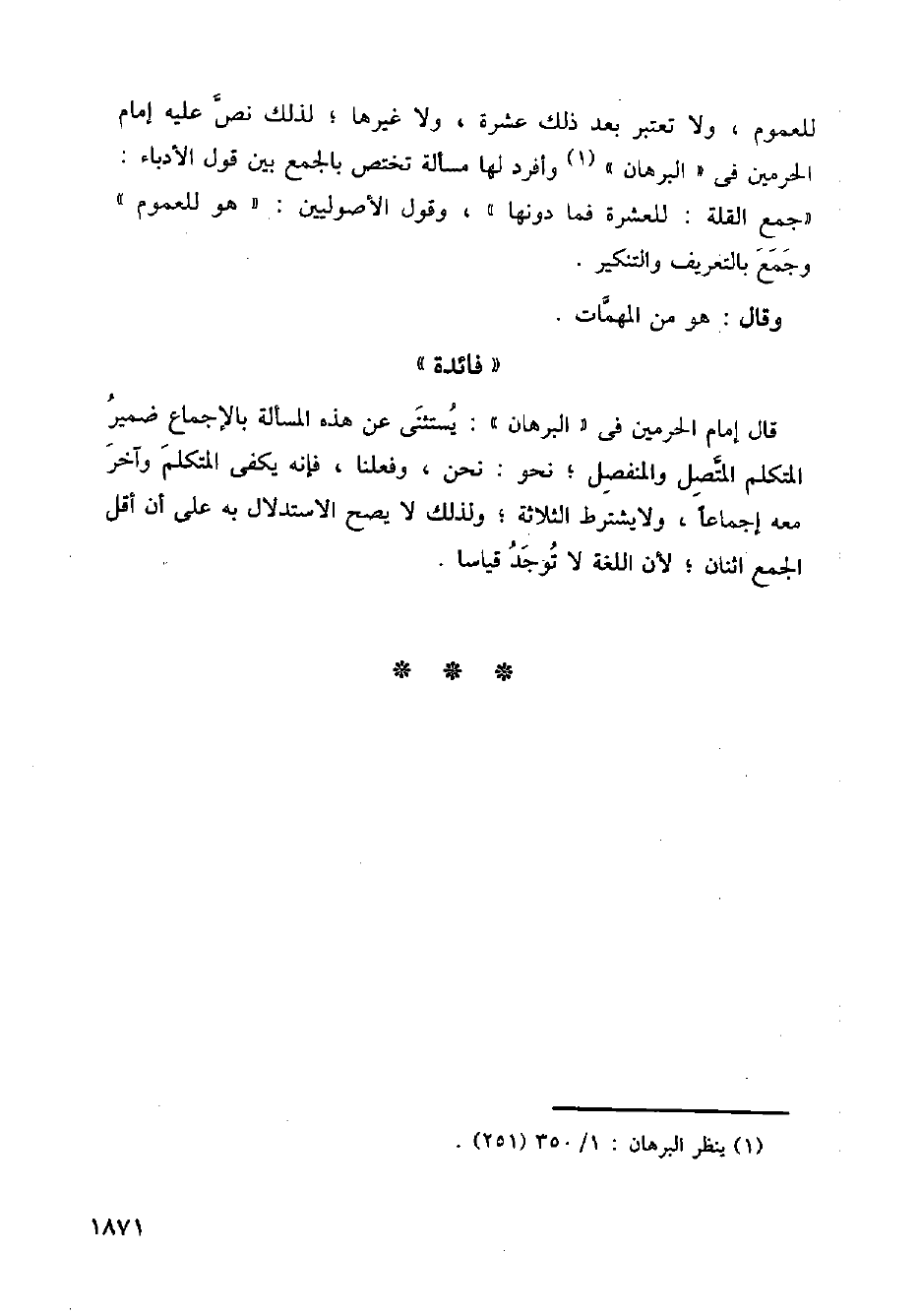 للعموم، ولا تعتبر بعد ذلك عشرة، ولا غيرها؛ لذلك نص عليه إمام الحرمين في (البرهان) وأفرد لها مسألة تخص بالجمع بين قول الأدباء: " جمع القلة: للعشرة فما دونها "، وقول الأصوليين: " هو للعموم " وجمع بالتعريف والتنكير.