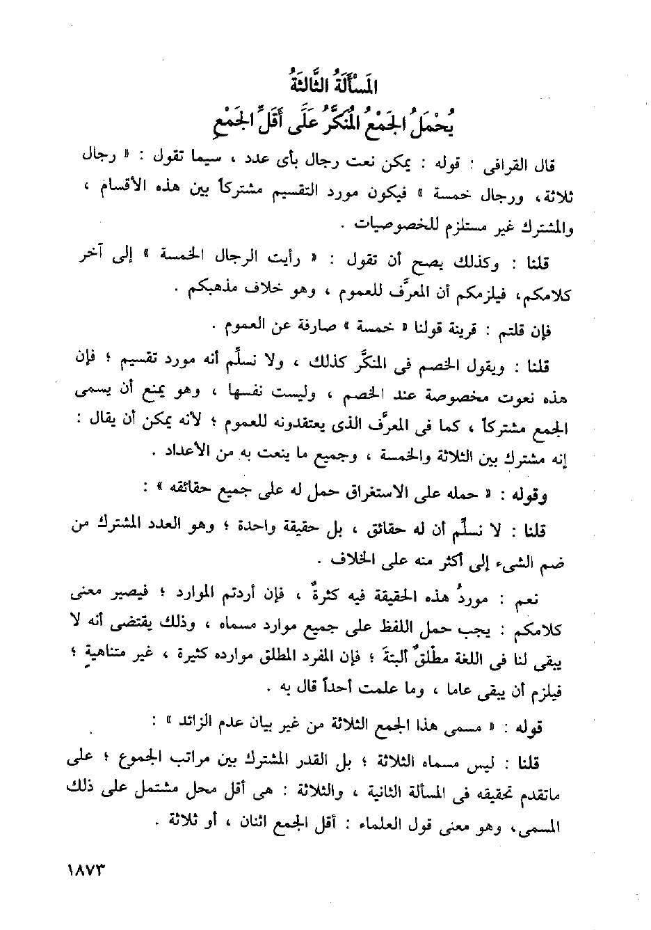 قلنا: ليس مسماه الثلاثة؛ بل القدر المشترك بين مراتب الجموع؛ على ماتقدم تحقيقه في المسألة الثانية، والثالثة: هي أقل محل مشتمل على ذلك المسمى، وهو معنى قوله العلماء: أقل الجمع اثنان، أو ثلاثة.