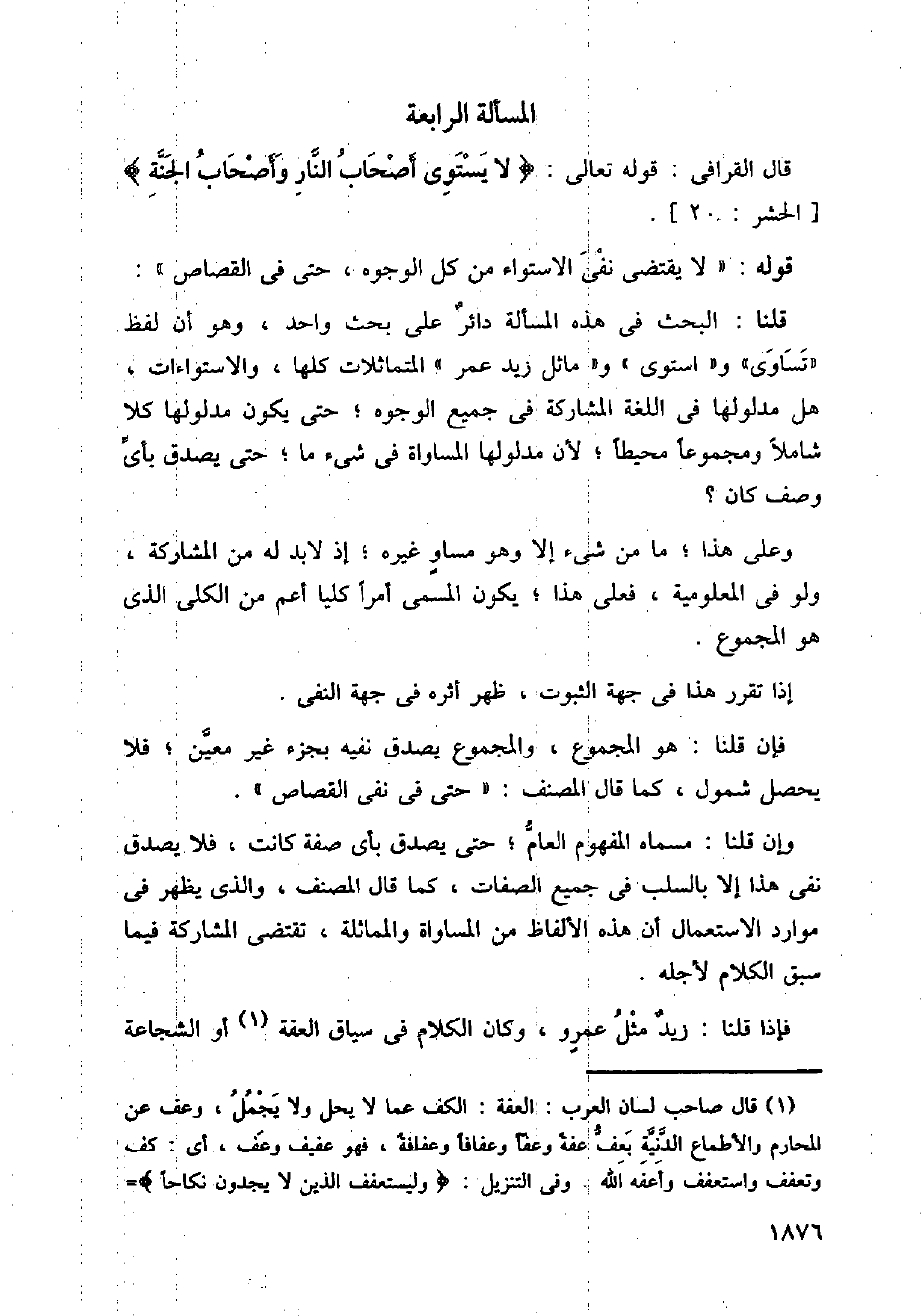 قال القرافي: قوله تعالى: {لايستوي أصحاب النار وأصحاب الجنة} [الحشر: 20].