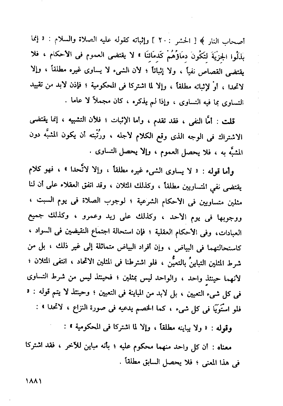 وأما قوله: " لا يساوي الشيء غيره مطلقا، وغلا لاتحدا "، فهو كلام يقتضي نفي المتساويين مطلقا، وكذلك المثلان، وقد اتفق العقلاء على أن لنا مثلين متساويين في الأحكام الشرعية؛ لوجوب الصلاة في يوم السبت، ووجوبها في يوم الأححد، وكذلك على زيد وعمرو، وكذلك جميع العبادات، وفي الأحكام العقلية؛ فإن استحالة اجتماع النقيضين في السواد، كاستحالتهما في البياض، وإن أفراد البياض متماثلة إلى غير ذلك، بل من شرط المثلين التبيان بالتعين، فلو اشترطنا في المثلين الاتحاد، انتفى المثلان؛ لأنهما حينئذ واحد، والواحد ليس بمثلين؛ فحينئ1 ليس من شرط التساوي في كل شيء التعيين، بل لابد من المباينة في التعيين؛ وحينئذ لايتم قوله: " فلو استويا في كل شيء، كما الخصم يدعيه في صورة النزاع، لاتحدا ".