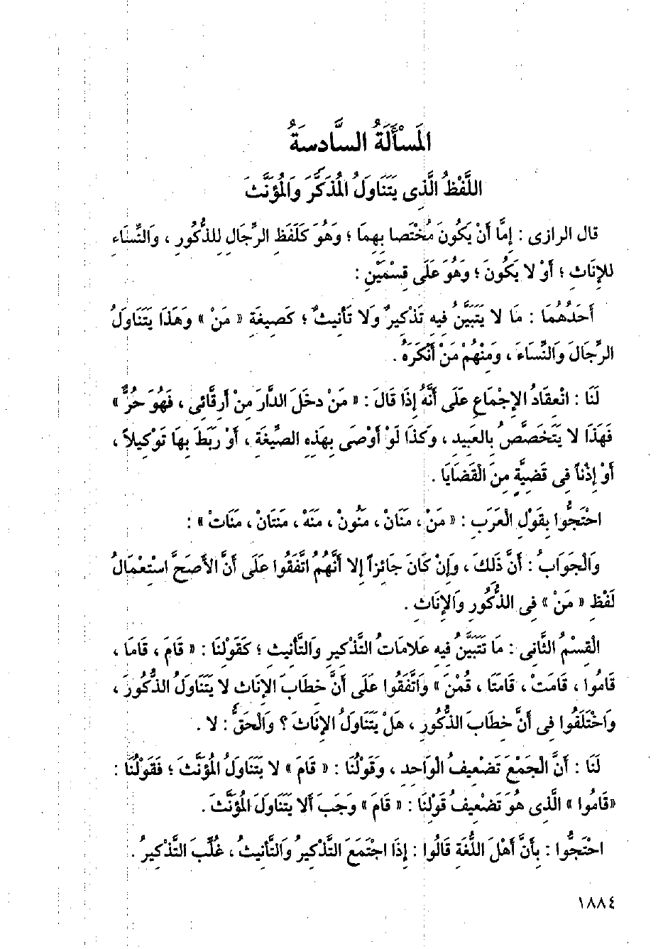 القسم الثاني: ما تتبين فيه علامات التذكير والتأنيث؛ كقولنا: " قام، قاما، قاموا، قامت، قامتا، قمن " واتفقوا على أن خطاب الإناث لا يتناول الذكور، واختلفوا في أن خطاب الذكور، هل يتناول الإناث؟ والحق: لا.