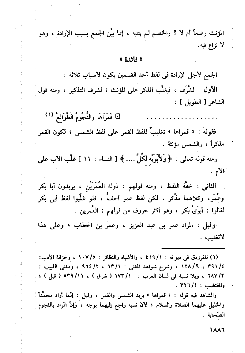 الثاني: خفه اللفظ، ومنه قولهم: دولة العمرين، يريدون أبا بكر وعمر، وكلاهما مذكر، لكن لفظ عمر أخف، فلو غبوا لفظ أبي بكر لقالوا: ابوي بكر، وهو أكثر حروف من قولهم: العمرين.