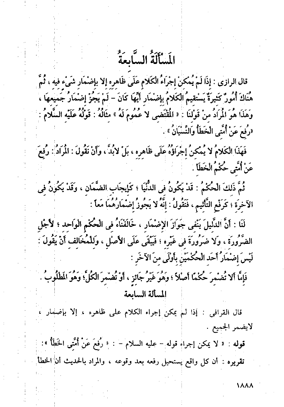 قال الرازي: إذا لم يمكن إجراء الكلام على ظاهرة إلا بإضمار شيء فيه، ثم هناك أمور كثيرة يستقيم الكلام بإضمار أيها كان لم يجز إضمار جميعها، وهذا هو المراد من قولنا: " المقتضى لا عموم له " مثاله: قوله عليه السلام: " رفع عن أمتي الخطأ والنسيان ".