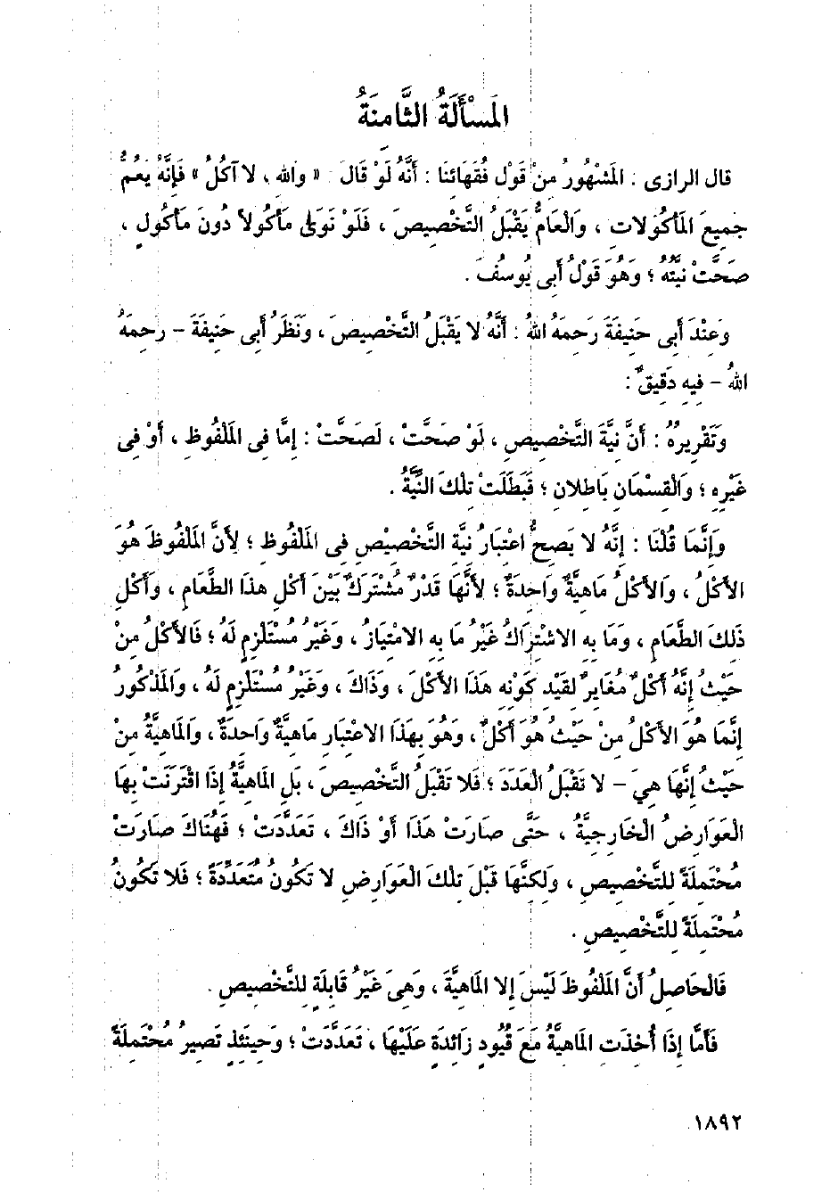 وإنما قلنا: إنه لا يصح اعتبار نية التخصيص في الملفوظ؛ لأن الملفوظ هو الأكل، والأكل ماهيتة واحدة؛ لأنها قدر مشترك بين أكل هذا الطعام، وأكل ذلك الطعام، وما به الاشتراك غير ما به الامتياز، وغير مستلزم له؛ فالأكل من حيث أنه أكل مغاير لقيد كونه هذا الأكل، وذاك، وغير مستلزم له، والمذكور إنما هو الأكل من حيث هو أكل، وهو بهذا الاعتبار ماهية واحدة، والماهية من حيث إها هي لا تقبل العدد؛ فلا تقبل التخصيص، بل الماهية إذا اقترنت بها العوارض الخارجية، حتى صارت هذا أو ذاك، تعددت؛ فهناك صارت محتملة للتخصيص، ولكنها قبل تلك العوارض لا تكون متعددة؛ فلا تكون محتملة للتخصيص.