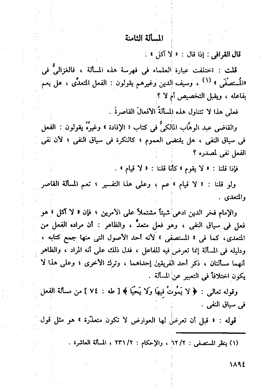 والقاضي عبد الوهاب المالكي في كتاب (الإفادة) وغيره يقولون: الفعل في سياق النفي، هل يقتضي العموم؛ كالنكرة في سياق النفي؛ لأن نفي الفعل نفي لمصدرة؟