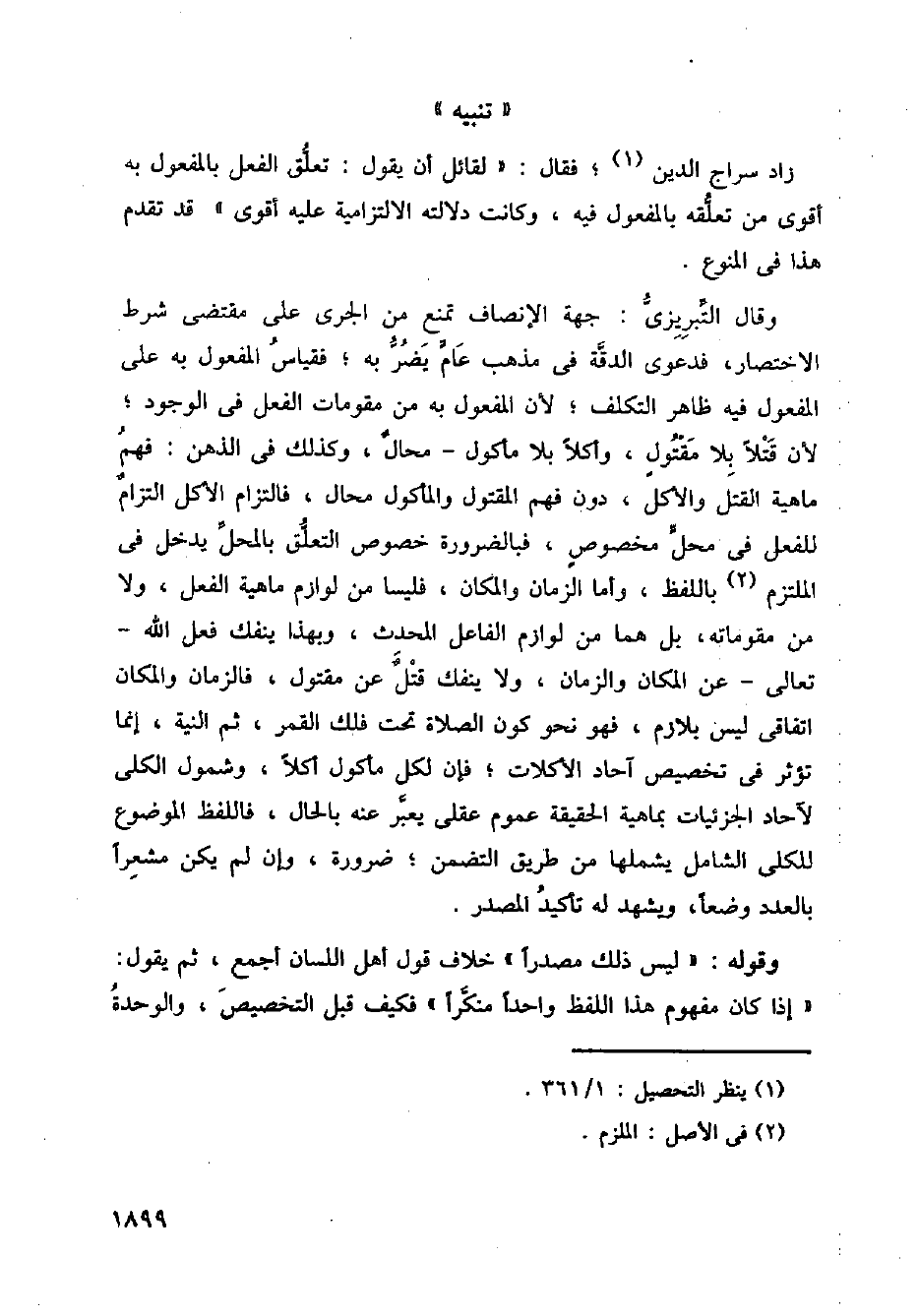 زاد سراج الدين؛ فقال: "لقائل ان يقول: تعلق الفعل بالمفعول به أقوى من تعلقه بالمفعول فيه، وكانت دلالته الالتزامية عليه أقوى " قد تقدم هذا في المنوع.