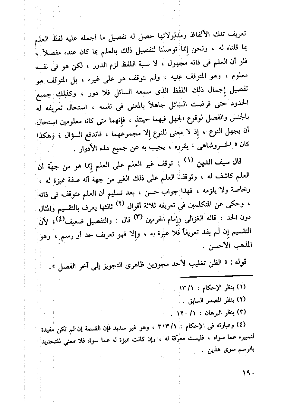 قال شيف الدين: توقف غير العلم على العلم إنما هو من جهة أن العلم كاشف له، وتوقف العلم على ذلك الغير من جهة أنه صفة مميزة له، وخاصة ولا يلزمه، فهذا جواب حسن، بعد تسليم أن العلم متوقف في ذاته وحكى عن المتكلمين في تعريفه ثلاثة أقوال ثالثها بالتقسيم والمثال دون الحد، قاله الغزالى وإمام الحرمين قال: والتفصيل ضعيف؛ لأن التقسيم إن لم يفد تعريفا فهلا عبرة به، وإلا فهو تعريف حد أو رسم، وهو المذهب الأحسن.