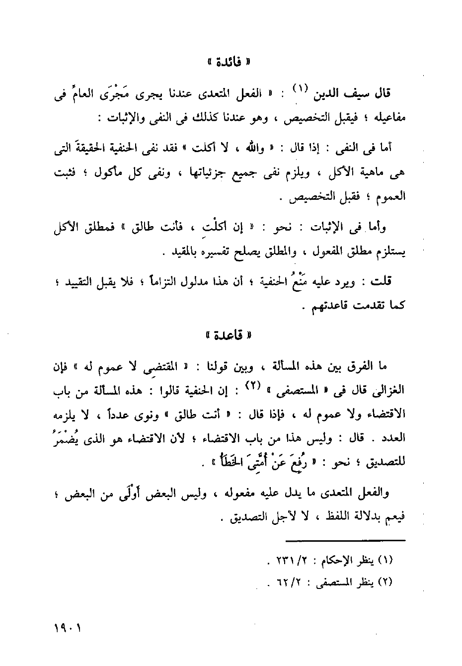 قال سيف الدين: " الفعل المتعدي عندنا يجري مجرى العام في مفاعليه؛ فيقبل التخصيص، وهو عندنا كذلك في النفي والإثبات.