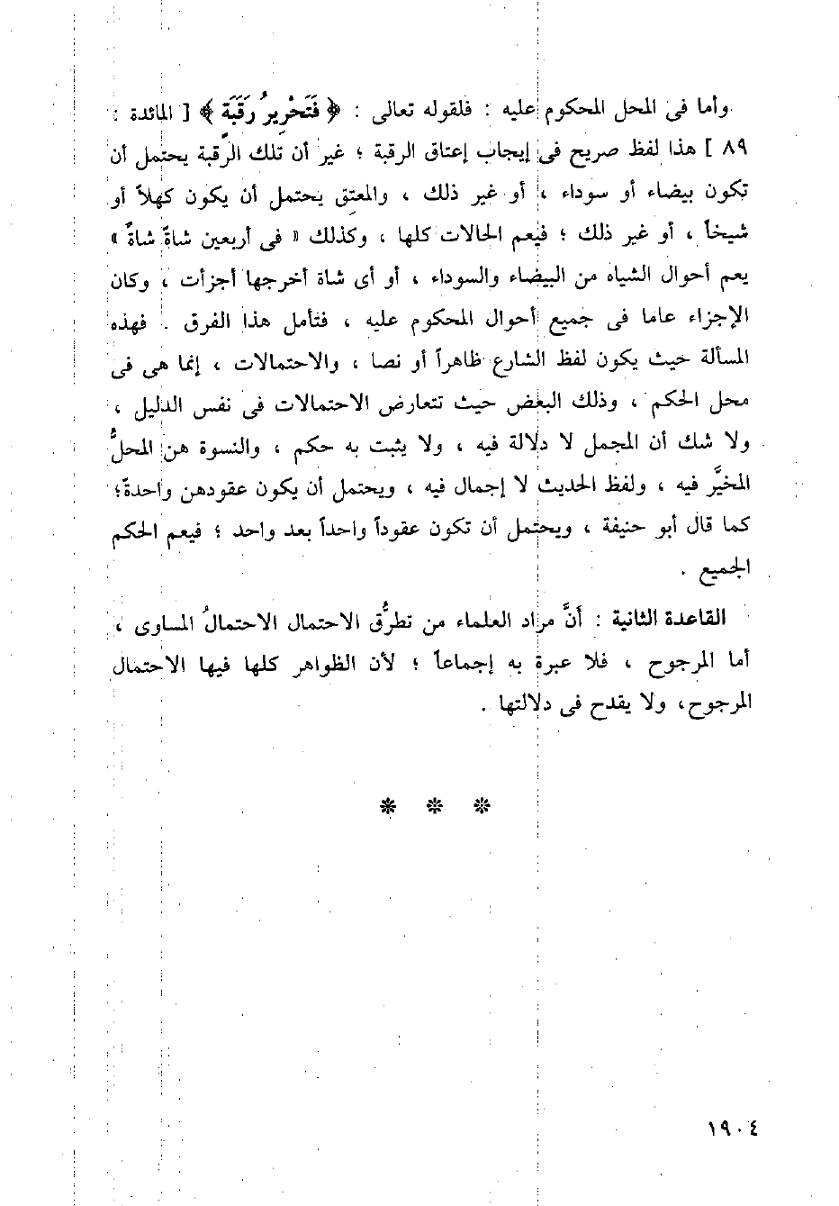 وأما في المحل المحكوم عليه: فقوله تعالى: {فتحرير رقبة} [المائدة: 89] هذا لفظ صريح في إيجاب إعتاق الرقبة؛ غير أن تلك الرقبة يحتمل أن تكون بيضاء أو سوداء، أو غير ذلك، والمعتق يحتمل أن يكون كهلا أو شيخا، أو غير ذلك؛ فيعم الحالات كلها، وكذلك " في أربعين شاة شاة " يعم أحوالا لشياه من البيضاء والسوداء، أو أي شاة أخرجها أجزأت، وكان الإجزاء عاما في جميع أحوال المحكوم عليه، فتأمل هذا الفرق.