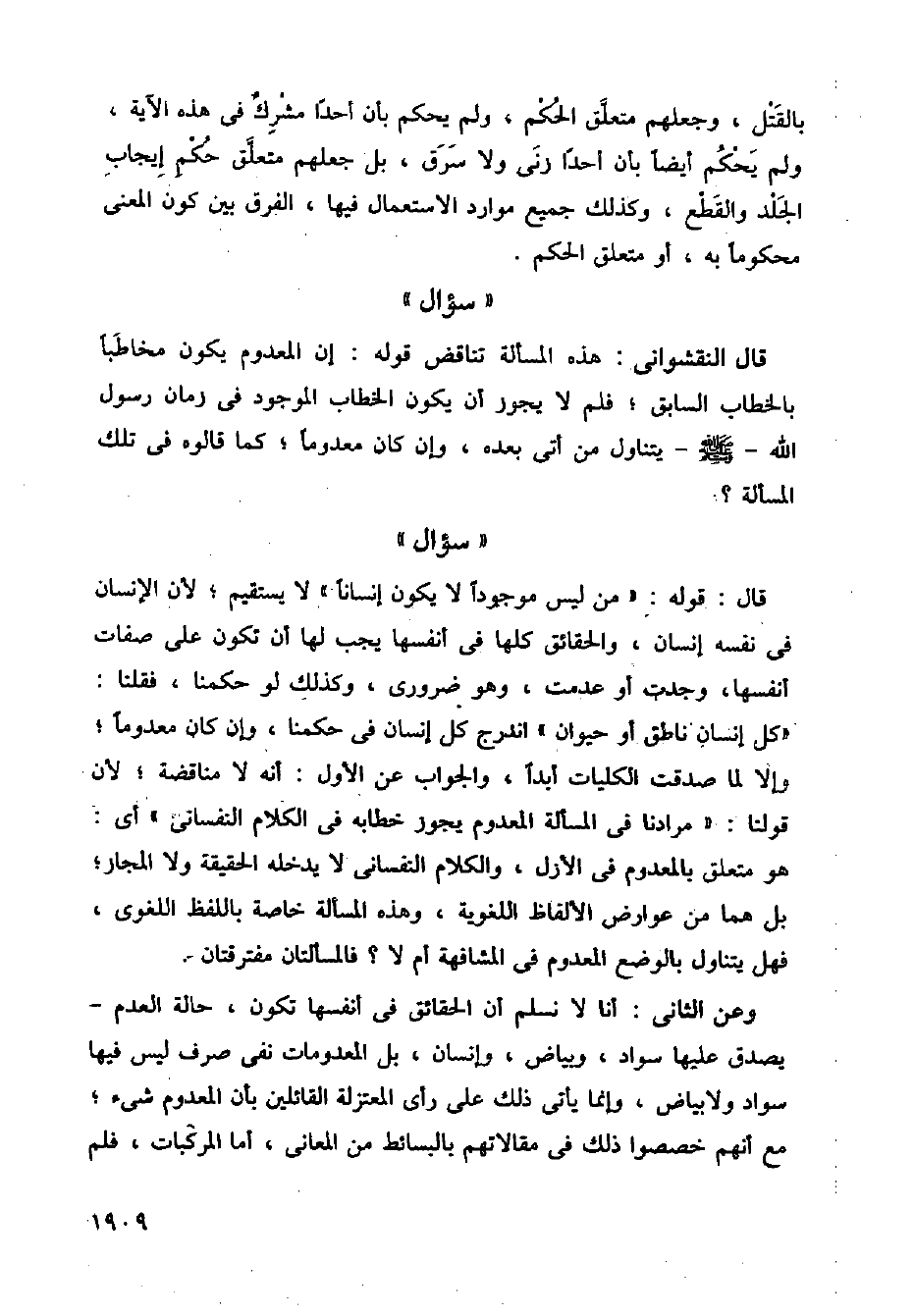 قال النقشواني: هذه المسألة تناقض قوله: إن المعدوم يكون مخاطبا بالخطاب السابق؛ فلم لا يجوز أن يكون الخطاب الموجود في زمان رسول الله صلى الله عليه وسلم يتناول من أتى بعده، وإن كان معدوما؛ كما قالوه في تلك المسألة؟
