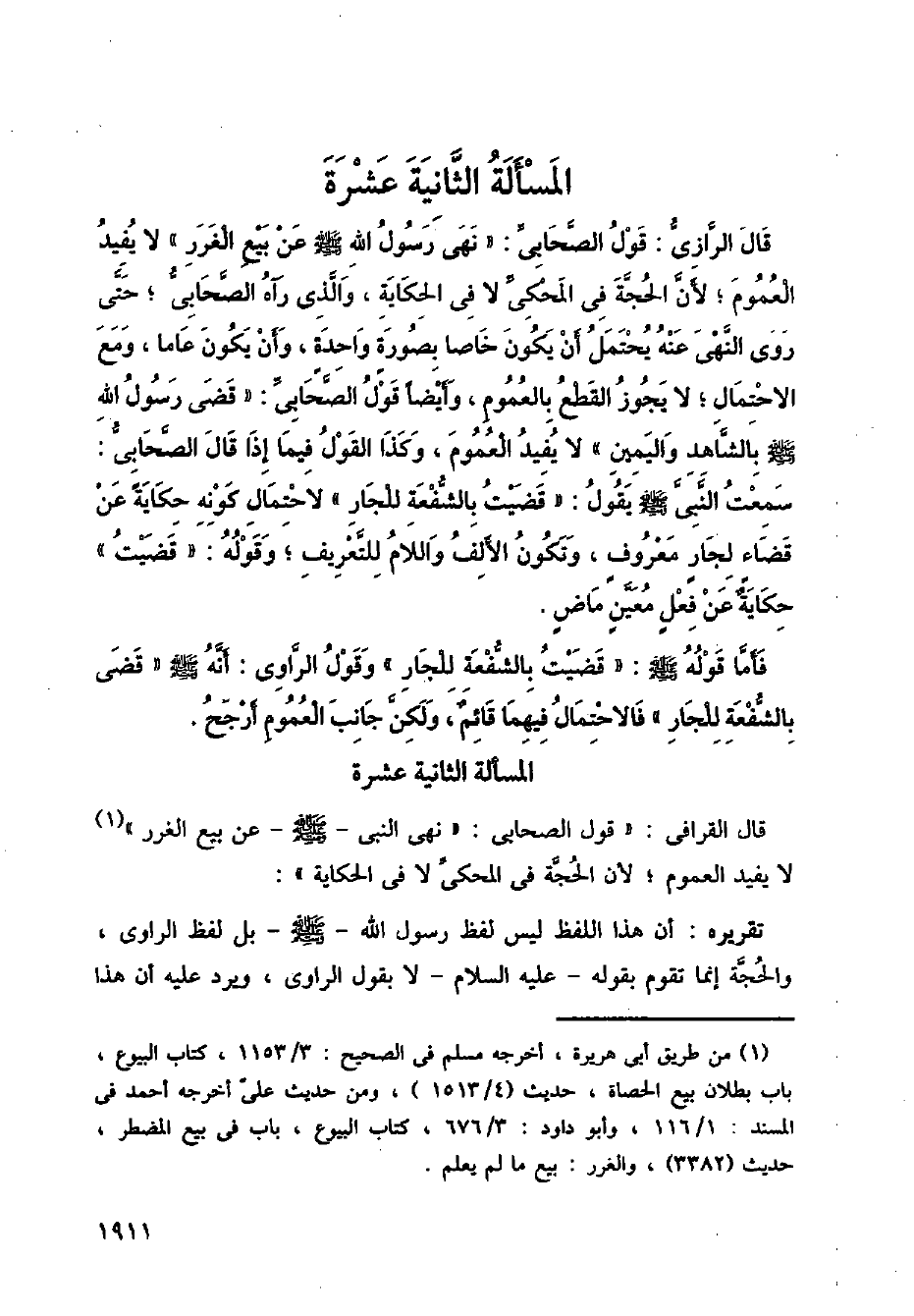 قال الرازي: قول الصحابي: " نهى رسول الله صلى الله عليه وسلم عن بيع الغرر " لا يفيد العموم؛ لأن الحجة في المحكة لا في الحكاية، والذي رآه الصحابي؛ حتى روى النهي عنه يحتمل أن يكون خاصا بصورة واحدة، وأن يكون عاما، ومع الاحتمال؛ لا يجوز القطع بالعموم، وأيضا قول الصحابي:" قضى رسول الله صلى الله عليه وسلم بالشاهد واليمين " لا يفيد العموم، وكذا القول فيما إذا قال الصحابي: سمعت النبي صلى الله عليه وسلم يقول: " قضيت بالشفعة للجار " لاحتمال كونه حكاية عن قضاء لجار معروف ن وتكون الألف واللام للتعريف؛ وقوله: " قضيت " حكاية عن فعل معين ماض.