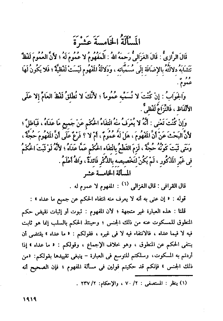 وإن كنت تعني: أنه لا يعرف منه انتفاء الحكم عن جميع ما عداه، فباطل؛ لأن البحث عن أن المفهوم، هل له عموم، أم لا؟ فرع على أن المفهوم حجة، ومتى ثبت كونه حجة، لزم القطع بانتفاء الحكم عما عداه؛ لأنه لو ثبت الحكم في غير المذكور، لم يكن لتخصيصه بالذكر فائدة، والله أعلم.