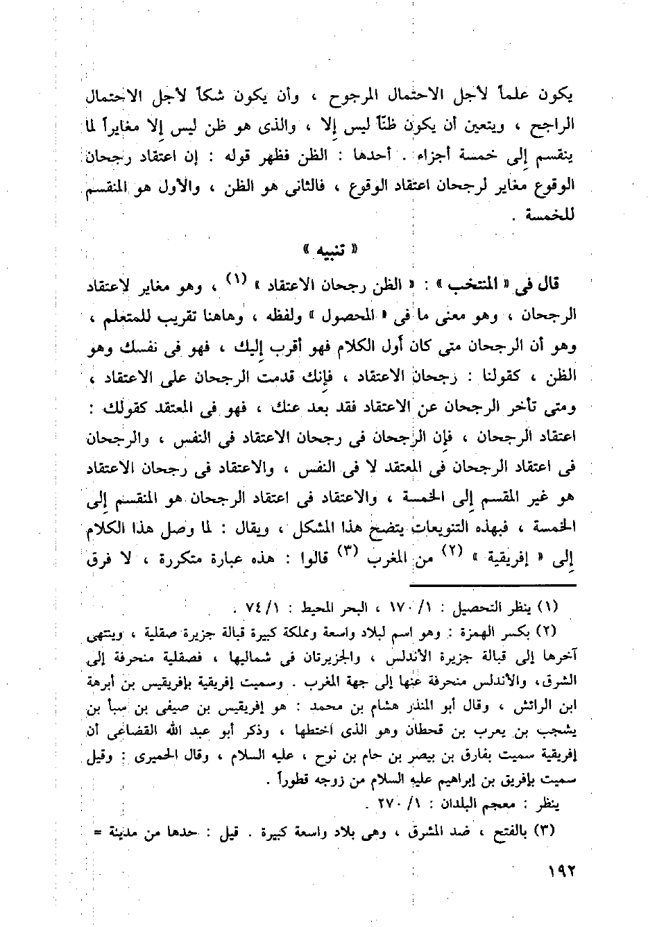 قال في ((المنتخب)): ((الظن رجحان الاعتقاد))، وهو مغاير لاعتقاد الرجحان، وهو معنى ما في ((المحصول)) ولفظه، وهاهنا تقريب للمتعلم، وهو أن لارجحان متى كان أول الكلام فهو أقرب إليه، فهو في نفسك وهو الظن، كقولنا: رجحان الاعتقاد، فإن قدمت الرجحان على الاعتقاد، ومتى تأخر الرجحان عن الاعتقاد فقد بعد عنك، فهو في المعتقد كقولك: اعتقاد الرجحان، فإن الرجحان فيى رجحان الاعتقاد في النفس، والرجحان في اعتقاد الرجحان في المعتقد لا في النفس، والإعتقاد في رجحان الاعتقاد هو غير المقسم إلى الخمسة، والاعتقاد في اعقتاد الرجحان هو المنقسم إلى الخمسة، بهذه التنويعات يتضح هذا المشكل، ويقال: لما وصل هذا الكلام إلى ((إفريقية)) من المغرب قالوا: هذه عبارة متكررة، لا فرق