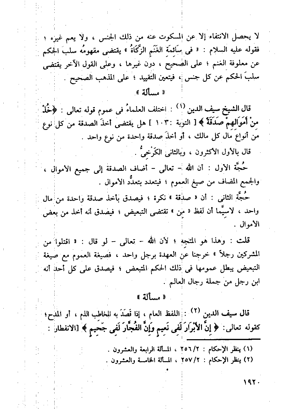 قال الشيخ سيف الدين: اختلف العلماء في عموم قوله تعالى: {خذ من أموالهم صدقة} [التوبة: 103] هل يقتضي أخذ الصدقة من كل نوع من أنواع مال كل مالك، أو أخذ صدقة واحدة من نوع واحد.