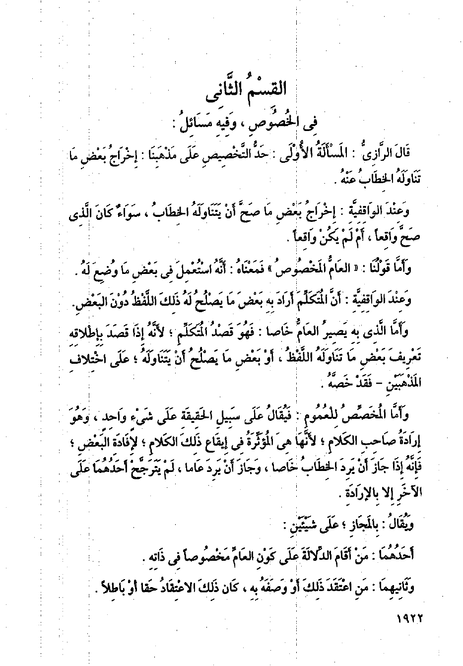 قال الرازي: المسألة الأولى: حد التخصيص على مذهبنا: إخراج بعض ما تناوله الخطاب عنه.