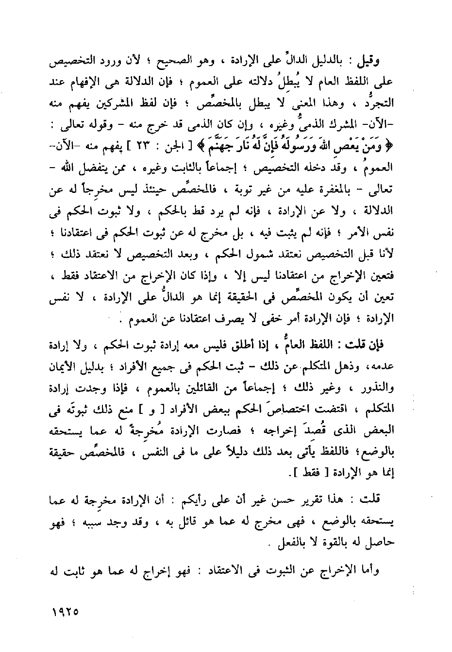 وقيل: بالدليل الدال على الإرادة، وهو الصحيح؛ لان ورود التخصيص على اللفظ العام لا يبطل دلالته على العموم؛ فإن الدلالة هي الإفهام عند التجرد، وهذا المعنى لا يبطل بالمخصص؛ فإن لفظ المشركين يفهم منه الآن المشرك الذمي وغيره، وإن كان الذمي قد خرج منه وقوله تعالى: {ومن يعص الله ورسوله فإن له نار جهنم} [الجن: 23] يفهم منه الآن العموم، وقد دخله التخصيص؛ إجماعا بالثابت وغيره، ممن يتفضل الله تعالى بالمغفرة عليه من غير توبه، فالمخصص حينئذ ليس مخرجا له عن الدلالة، ولا عن الإرادة، فإنه لم يرد قط بالحكم، ولا ثبوت الحكم في نفس الأمر؛ فإنه لم يثبت فيه، بل مخرج له عن ثبوت الحكم في اعتقادنا؛ لأنا قبل التخصيص نعتقد شمول الحكم، وبعد التخصيص لا نعتقد ذلك؛ فتعين الإخراج من اعتقادنا ليس غلا، وإذا كان الإخراج من الاعتقاد فقط، تعين أن يكون المخصص في الحقيقة غنما هو الدال على الإرادة، لا نفس الإرادة؛ فإن الغرادة أمر خفي لا يصرف اعتقادنا عن العموم.