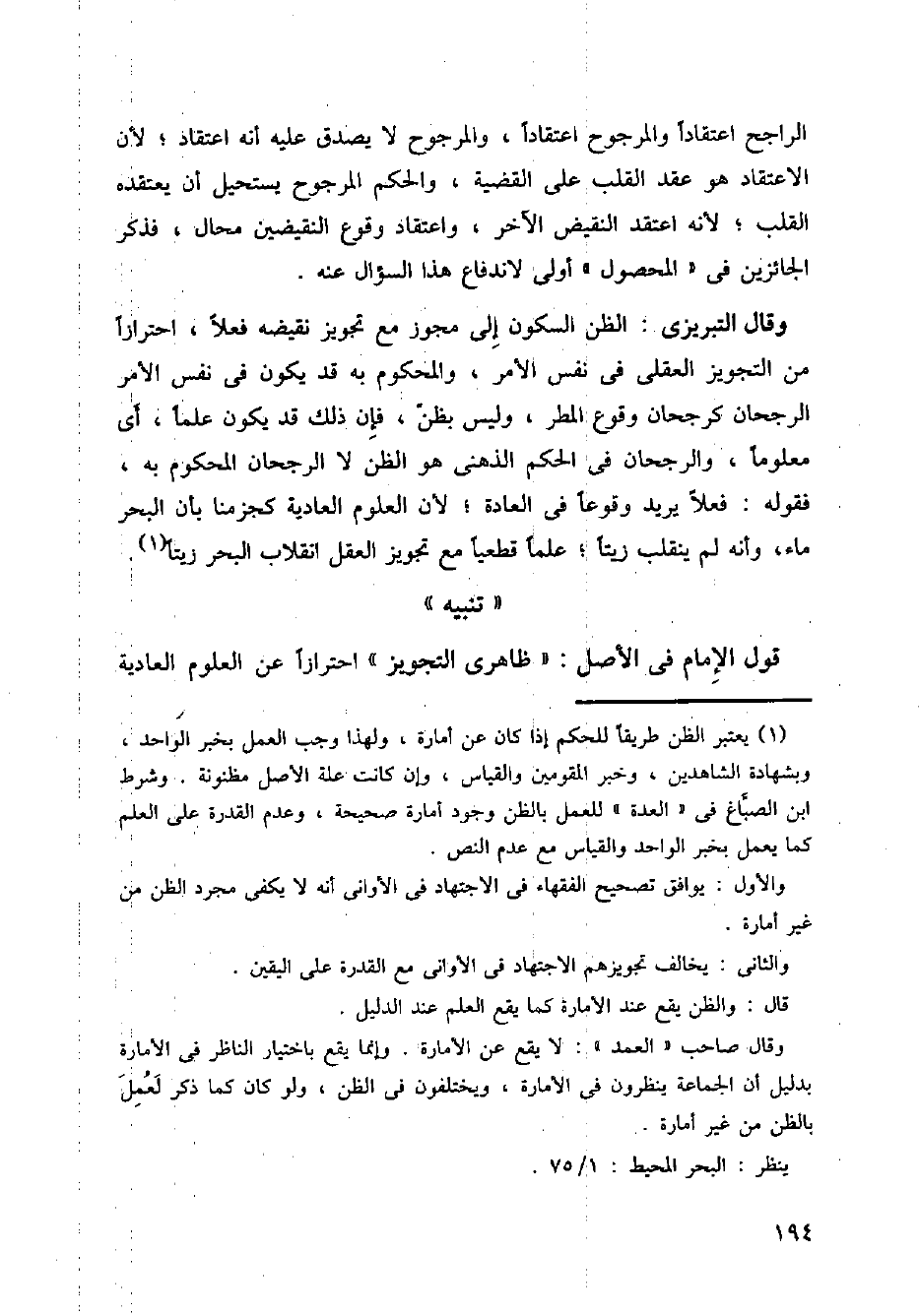 وقال التبرزى: الظن السكون إلى مجوز مع تجويز نقيضه فعلا، احترازا من التجويز العقلى في نفس الأمر، والمحكوم به قد يكون في نفس الأمر الرجحان كرجحان وقوع المطر، وليس بظن، فإن ذلك قد يكون علما، أي معلوما، والرجحان في الحكم الذهنى هو الظن لا الرجحان المحكوم به، فقوله: فعلا يريد وقوعا في العادة؛ لأن العلوم العادية كجزمنا بأن البحر ماء، وأنه لم ينقلب زيتا؛ علما قطعيا مع تجويز العقل انقلاب البحر زيتا.