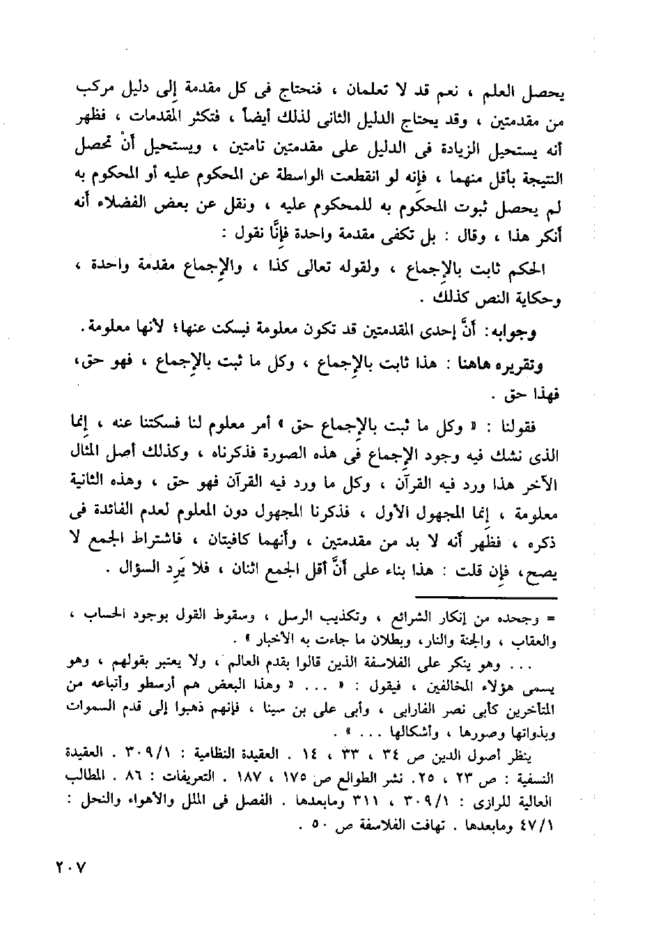 يحصل العلم، نعم قد لا تعلمان، فنحتاج في كل مقدمة إلى دليل مركب من مقدمتين، وقد يحتاج الدليل الثاني لذلك أيضا، فتكثر المقدمات، فظهر أنه يستحيل الزيادة في الديل على مقدمتين تامتين، ويستحيل أن تحصل النتيجة بأقل منهما، فإنه لو انقطعت الواسطة عن المحكوم عليه أو المحكون به لم يحصل ثبوت المحكوم به للمحكوم عليه، ونقل عن بعض الفضلاء أنه أنكر هذا، وقال: بل تكفي مقدمة واحدة فإنا نقول: