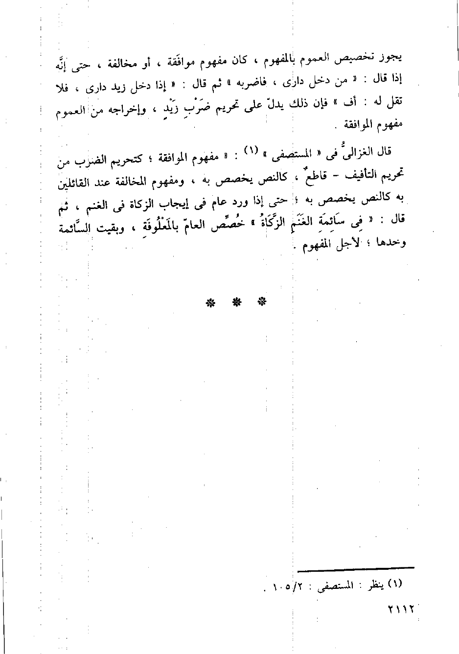 قال الغزالي في (المستصفى): (مفهوم الموافقة؛ كتحريم الضرب من تحريم التأفيف- قاطع، كالنص يخصص به، ومفهوم المخالفة عند القائلين به كالنص يخصص به؛ حتى إذا ورد عام في إيجاب الزكاة في الغنم، ثم قال: (في سائمة الغنم الزكاة) خصص العام بالمعلوفة، وبقيت السائمة وخدها؛ لأجل المفهوم.