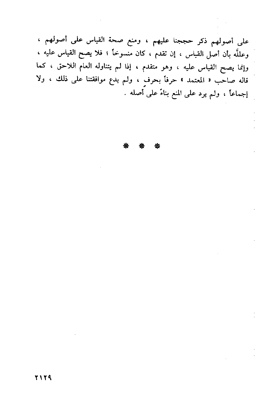 على أصولهم ذكر حججنا عليهم، ومنع صحة القياس على أصولهم، وعلله بأن أصل القياس، إن تقدم، كان منسوخًا؛ فلا يصح القياس عليه، وإنما يصح القياس عليه، وهو متقدم، إذا لم يتناوله العام اللاحق، كما قاله صاحب (المعتمد) حرفًا بحرف، ولم يدع موافقتنا على ذلك، ولا إجماعًا، ولم يرد على المنع بناءً على أصله.