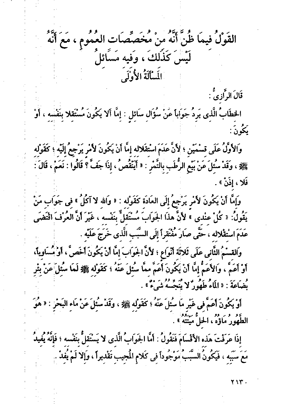 والقسم الثاني على ثلاثة أنواع؛ لأن الجواب إما أن يكون أخص، أو مساويًا، أو أعم، والأعم إما أن يكون أعم مما سئل عنه؛ كقوله - صلى الله عليه وسلم - لما سئل عن بئر بضاعة: (الماء طهور لا ينجسه شيء).