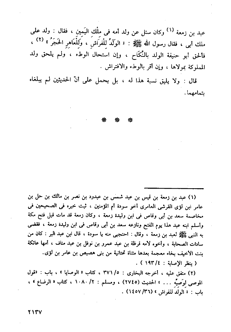 عبد بن زمعة وكان سئل عن ولد أمه في ملك اليمين، فقال: ولد على ملك أبي، فقال رسول الله - صلى الله عليه وسلم -: (الولد للفراش، وللعاهر الحجر)، فألحق أبو حنيفة الولد بالنكاح، وإن استحال الوطء، ولم يلحق ولد المملوكة بمولاها، وإن أقر بالوطء والافتراش.