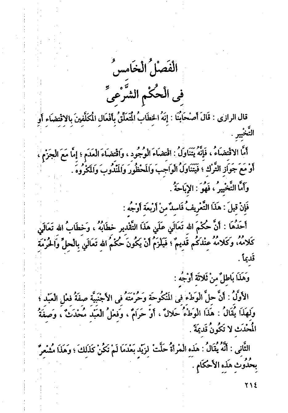 قال الرازي: قال أصحابنا: إنه الخطاب المتعلق بأفعال المكلفين بالإقتضاء أو التخيير.
