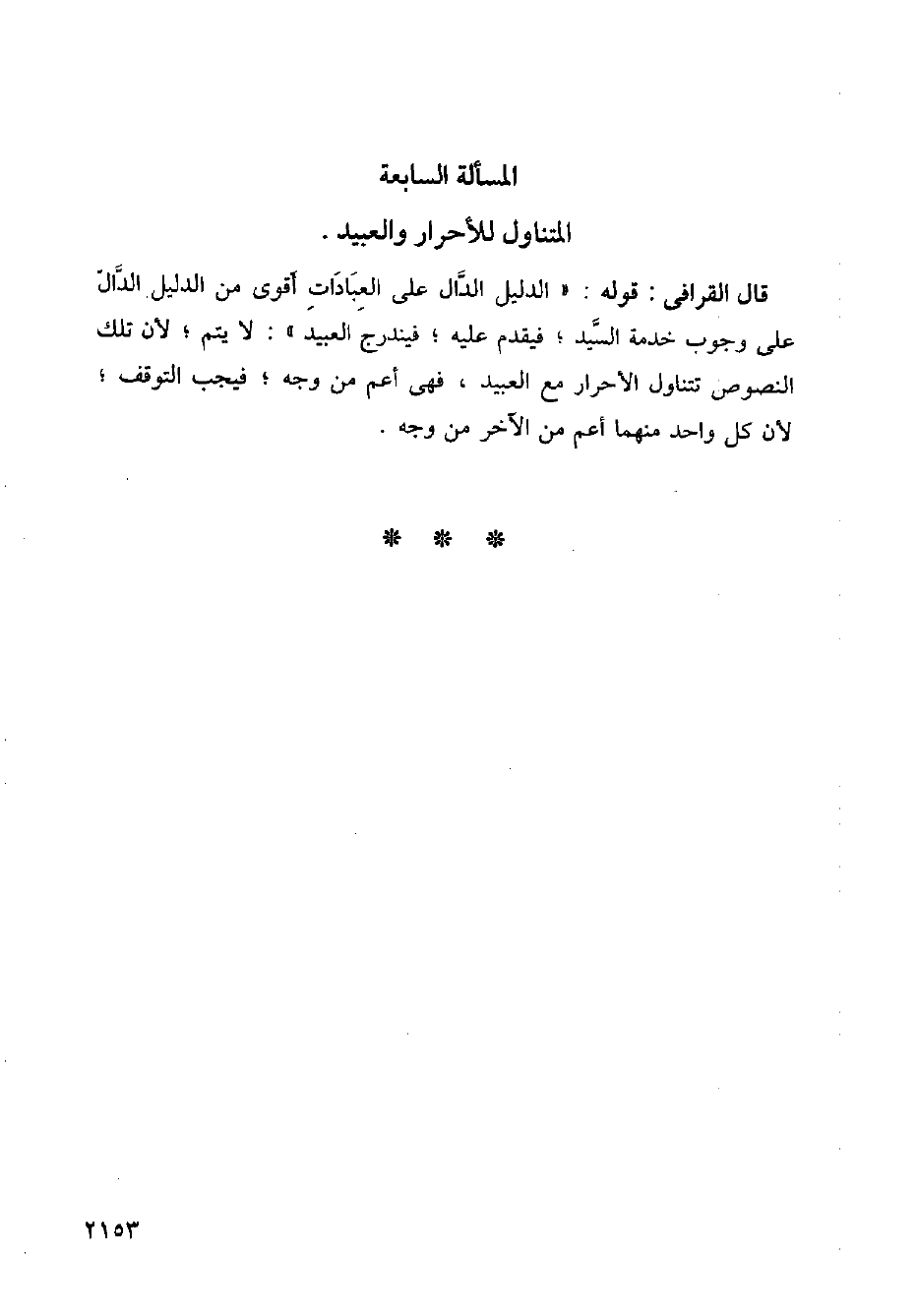 قال القرافي: قوله: (الدليل الدال على العبادات أقوى من الدليل الدال على وجوب خدمة السيد؛ فيقدم عليه؛ فيندرج العبيد): لا يتم؛ لأن تلك النصوص تتناول الأحرار مع العبيد، فهي أعم من وجه؛ فيجب التوقف؛ لأن كل واحد منهما أعم من الآخر من وجه.