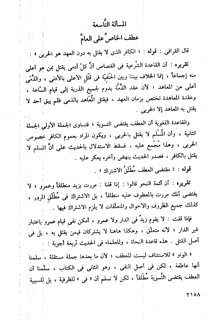 والقاعدة اللغوية أن العطف يقتضي التسوية؛ فتساوي الجملة الأولى الجملة الثانية، وأن المسلم لا يقتل بالحربي، ويكون المراد بعموم الكافر خصوص الحربي، وهذا مجمع عليه، فسقط الاستدلال بالحديث على أن المسلم لا يقتل بالكافر، فصدر الحديث ينهض وآخره يعكر عليه.