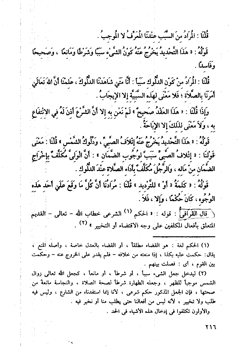 قال القرافي: قوله: ((الحكم الشرعي خطاب الله تعالى القديم المتعلق بأفعال المكلفين على وجه الاقتضاء أو التخيير)).