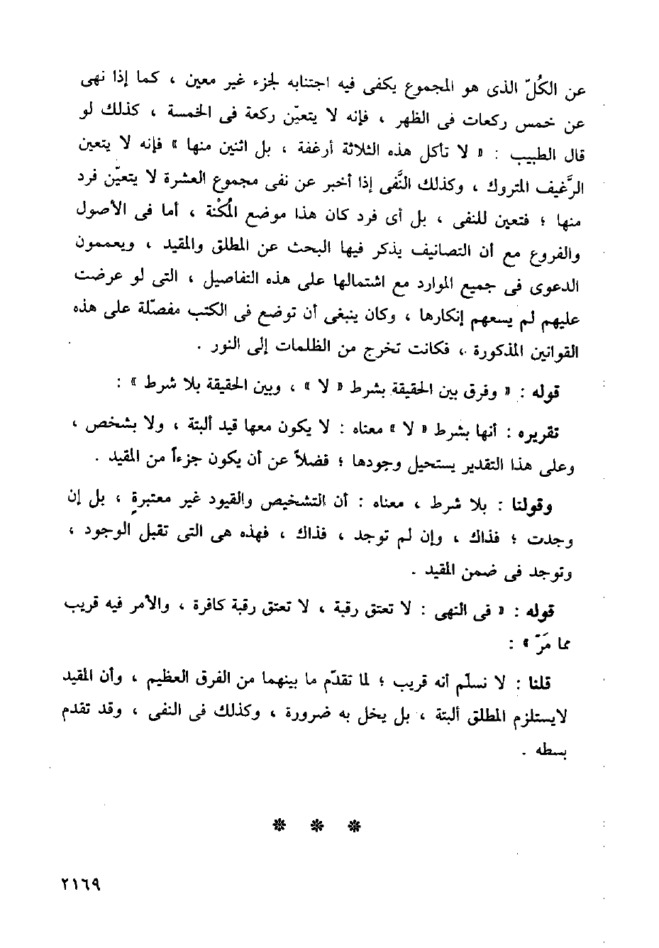 عن الكل الذي هو المجموع يكفي فيه اجتنابه لجزء غير معين، كما إذا نهي عن خمس ركعات في الظهر، فإنه لا يتعين ركعة في الخمسة، كذلك لو قال الطبيب: (لا تأكل هذه الثلاثة أرغفة، بل اثنين منها) فإنه لا يتعين الرغيف المتروك، وكذلك النفي إذا أخبر عن نفي مجموع العشرة لا يتعين فرد منها؛ فتعين للنفي، بل أي فرد كان هذا موضع المكنة، أما في الأصول والفروع مع أن التصانيف يذكر فيها البحث عن المطلق والمقيد، ويعممون الدعوي في جميع الموارد مع اشتمالها على هذه التفاصيل، التي لو عرضت عليهم لم يسعهم إنكارها، وكان ينبغي أن توضع في الكتب مفصلة على هذه القوانين المذكورة، فكانت تخرج من الظلمات إلى النور.