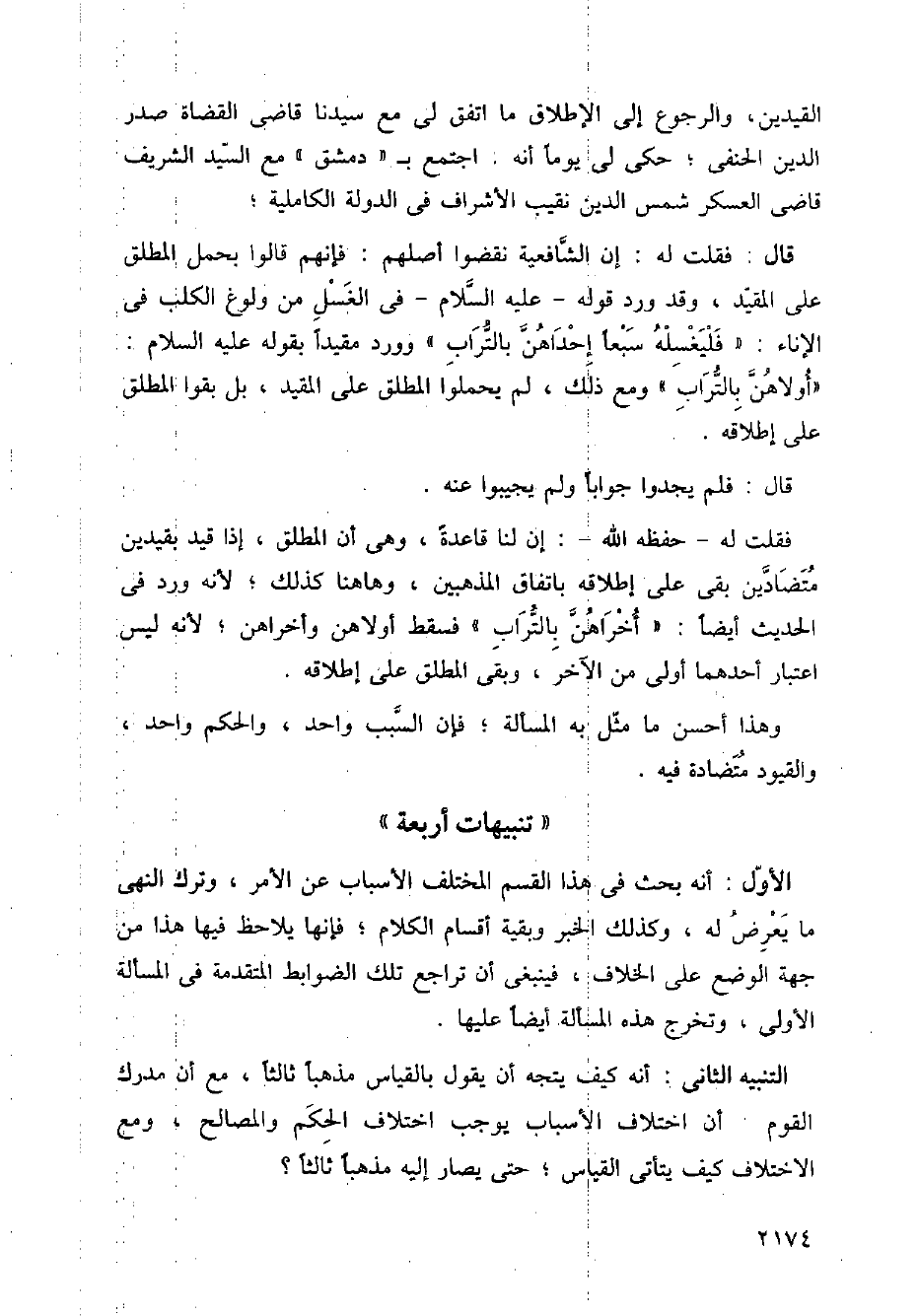 قال: فقلت له: إن الشافعية نقضوا أصلهم: فإنهم قالوا بحمل المطلق على المقيد، وقد ورد قوله- عليه السلام- في الغسل من ولوغ الكلي في الإناء: (فليغسله سبعًا إحداهن بالتراب) وورد مقيدًا بقوله عليه السلام: