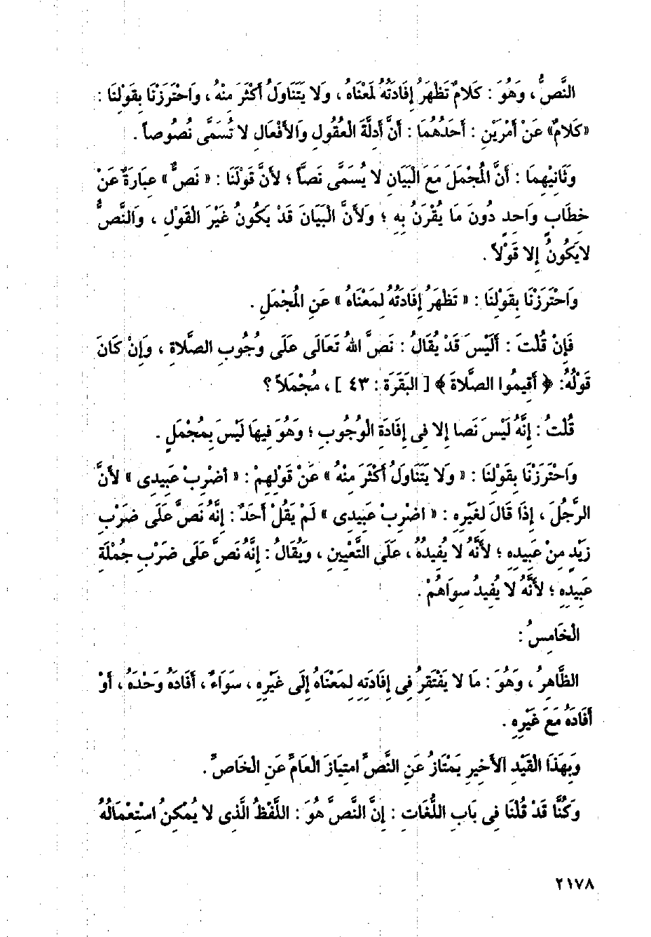 النص، وهو كلام تظهر إفادته لمعناه، ولا يتناول أكثر منه، واحترزنا بقولنا: (كلام) عن أمرين: أحدهما: أن أدلة العقول والأفعال لا تسمى نصوصًا.