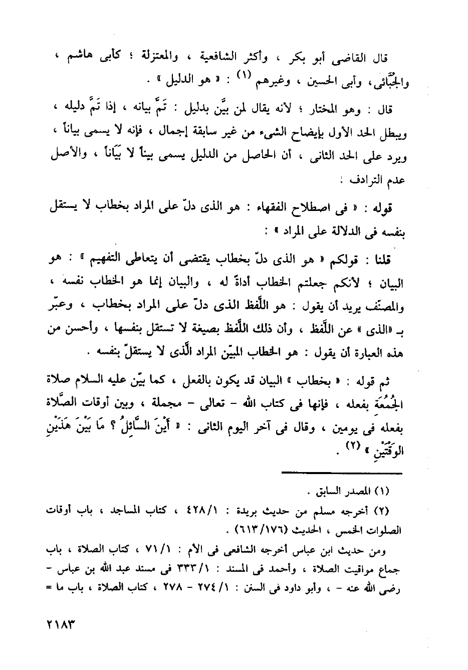 ثم قوله: (بخطاب) البيان قد يكون بالفعل، كما بين عليه السلام صلاة الجمعة بفعله، فإنها في كتاب الله - تعالى - مجملة، وبين أوقات الصلاة بفعله في يومين، وقال في آخر اليوم الثاني: (أين السائل؟ ما بين هذين الوقتين).