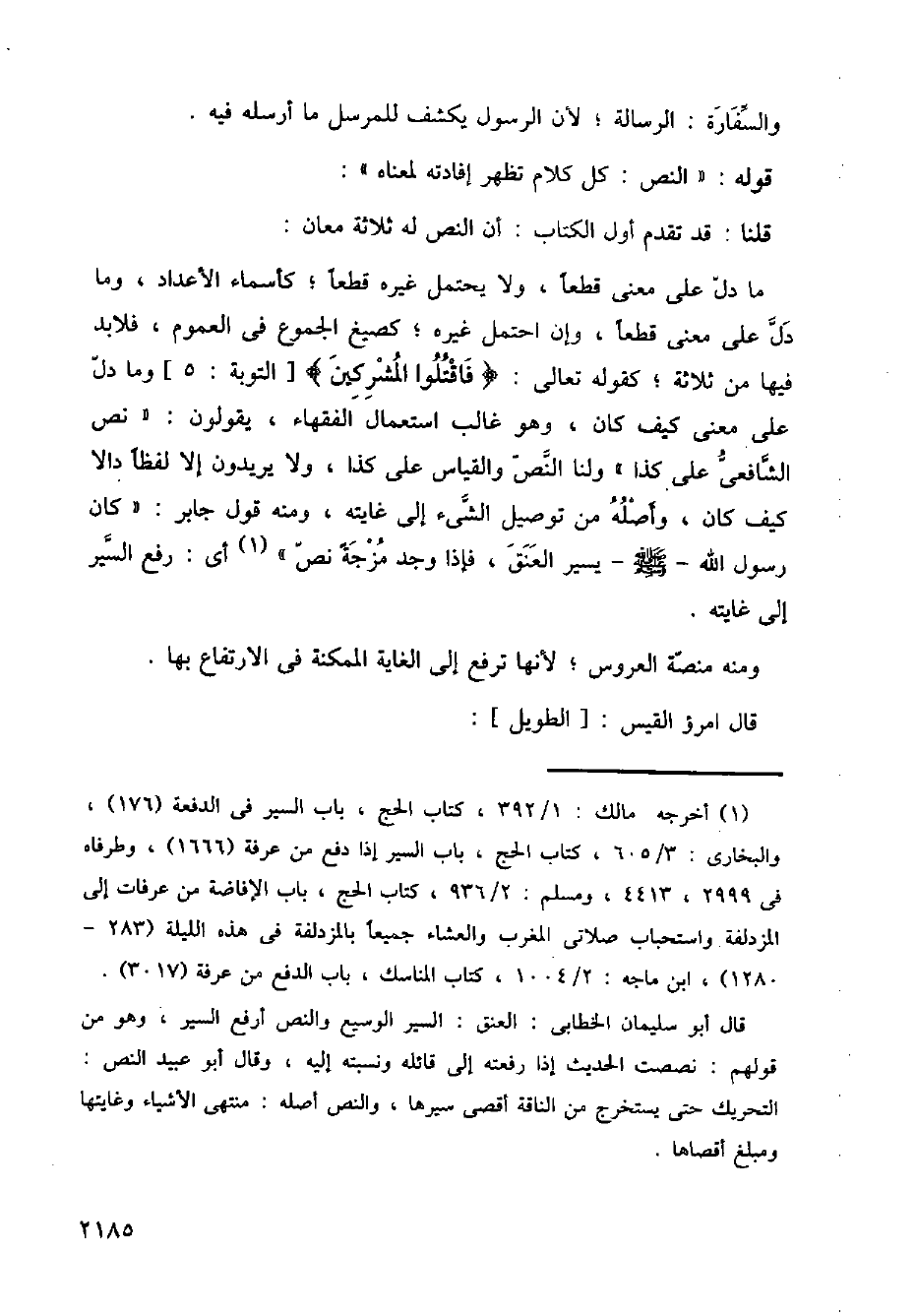 ما دل على معنى قطعًا، ولا يحتمل غيره قطعًا؛ كأسماء الأعداد، وما دل على معنى قطعًا، وإن احتمل غيره؛ كصيغ الجموع في العموم، فلابد فيها من ثلاثة؛ كقوله تعالى: {فاقتلوا المشركين} [التوبة: 5] وما دل على معنى كيف كان، وهو غالب استعمال الفقهاء، يقولون: (نص الشافعي على كذا) ولنا النص والقياس على كذا، ولا يريدون إلا لفظًا دالاً كيف كان، وأصله من توصيل الشي إلى غايته، ومنه قول جابر: (كان رسول الله - صلى الله عليه وسلم - يسير العنق، فإذا وجد مزجة نص) أي: رفع السير إلى غايته.