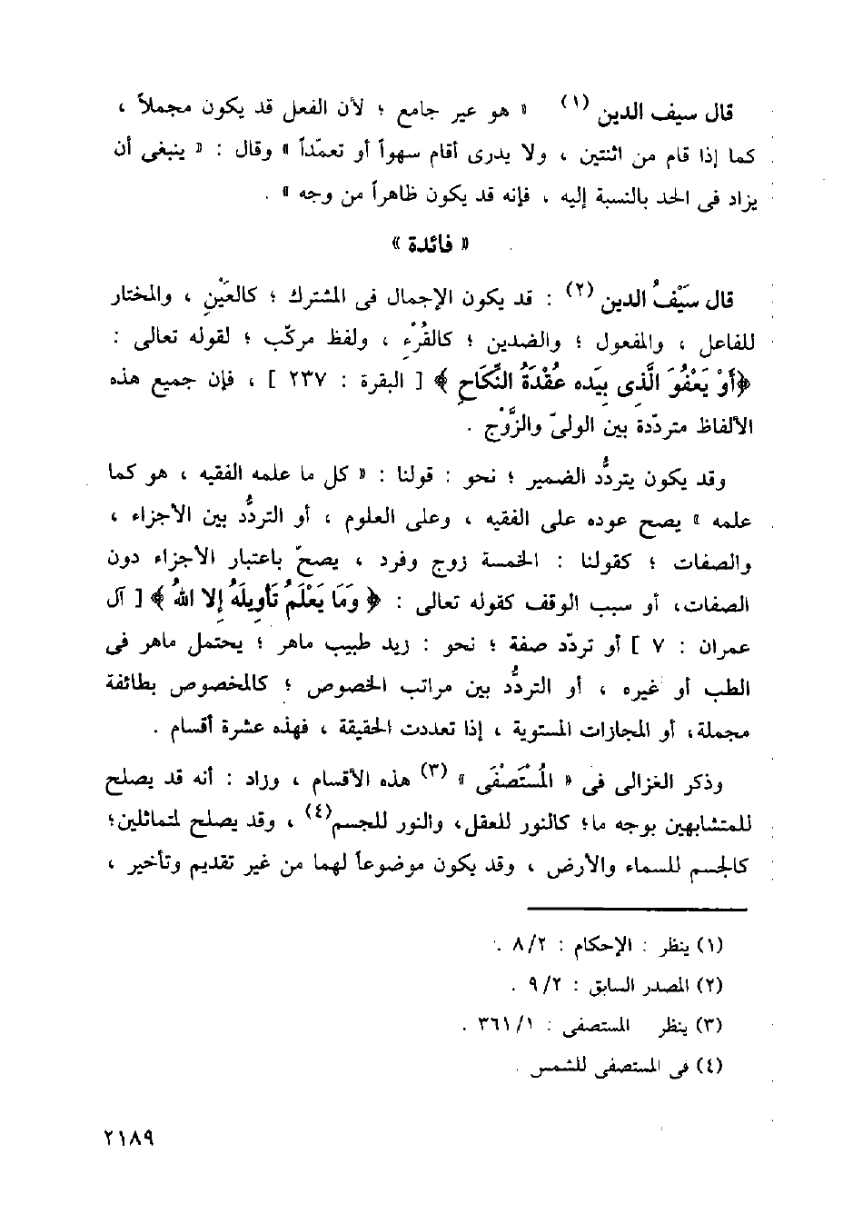 قال سيف الدين: قد يكون الإجمال في المشترك؛ كالعين، والمختار للفاعل، والمفعول؛ والضدين؛ كالقرء، ولفظ مركب؛ لقوله تعالى: {أو يعفو الذي بيده عقدة النكاح} [البقرة: 237]، فإن جميع هذه الألفاظ مترددة بين الولي والزوج.
