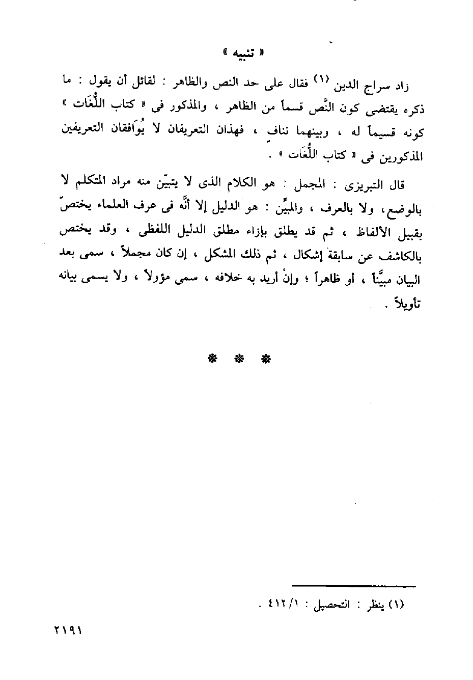 زاد سراج الدين فقال على حد النص والظاهر: لقائل أم يقول: ما ذكره يقتضي كون النص قسمًا من الظاهر، والمذكور في (كتاب اللغات) كونه قسيمًا له، وبينهما تناف، فهذا التعريفان لا يوافقان التعريفين المذكورين في (كتاب اللغات).