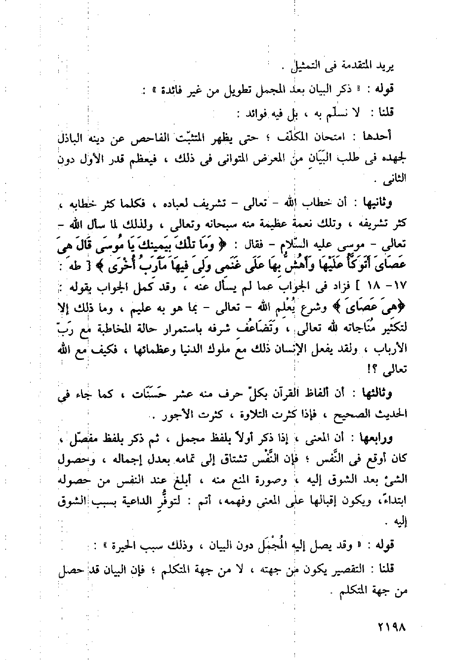 ورابعها: أن المعنى، إذا ذكر أولاً بلفظ مجمل، ثم ذكر بلفظ مفصل، كان أوقع في النفس؛ فإن النفس تشتاق إلى تمامه بعدل إجماله، وحصول الشيء بعد الشوق إليه، وصورة المنع منه، أبلغ عند النفس من حصوله ابتداءً، ويكون إقبالها على المعنى وفهمه، أتم: لتوفر الداعية بسبب الشوق إليه.
